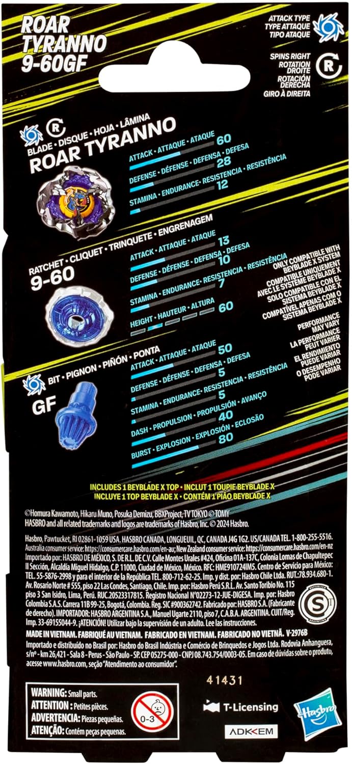 - ¡Pruébalo en batalla! Beyblade X trae la emoción de la competencia con un juguete de batalla giratorio de ritmo rápido que desafía a los aspirantes a Beymasters a subir de nivel su juego. Monta tus tops, carga tus lanzadores, y 3-2-1 ¡Deja que se rompa! (Se requiere Beyblade X Beystadium y lanzador, se venden por separado)