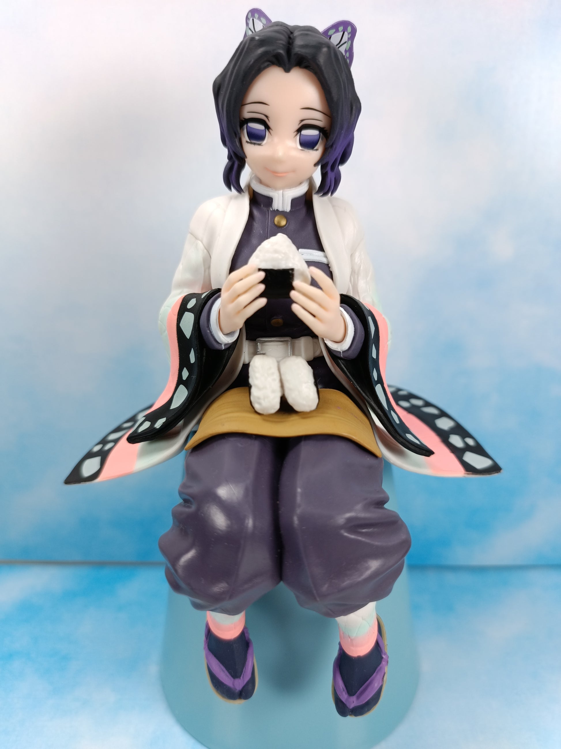 De la popular serie de anime Demon Slayer: Kimetsu no Yaiba viene una figura de Shinobu Kocho. ¡Shinobu aparece con su atuendo icónico disfrutando de un poco de Onigiri!