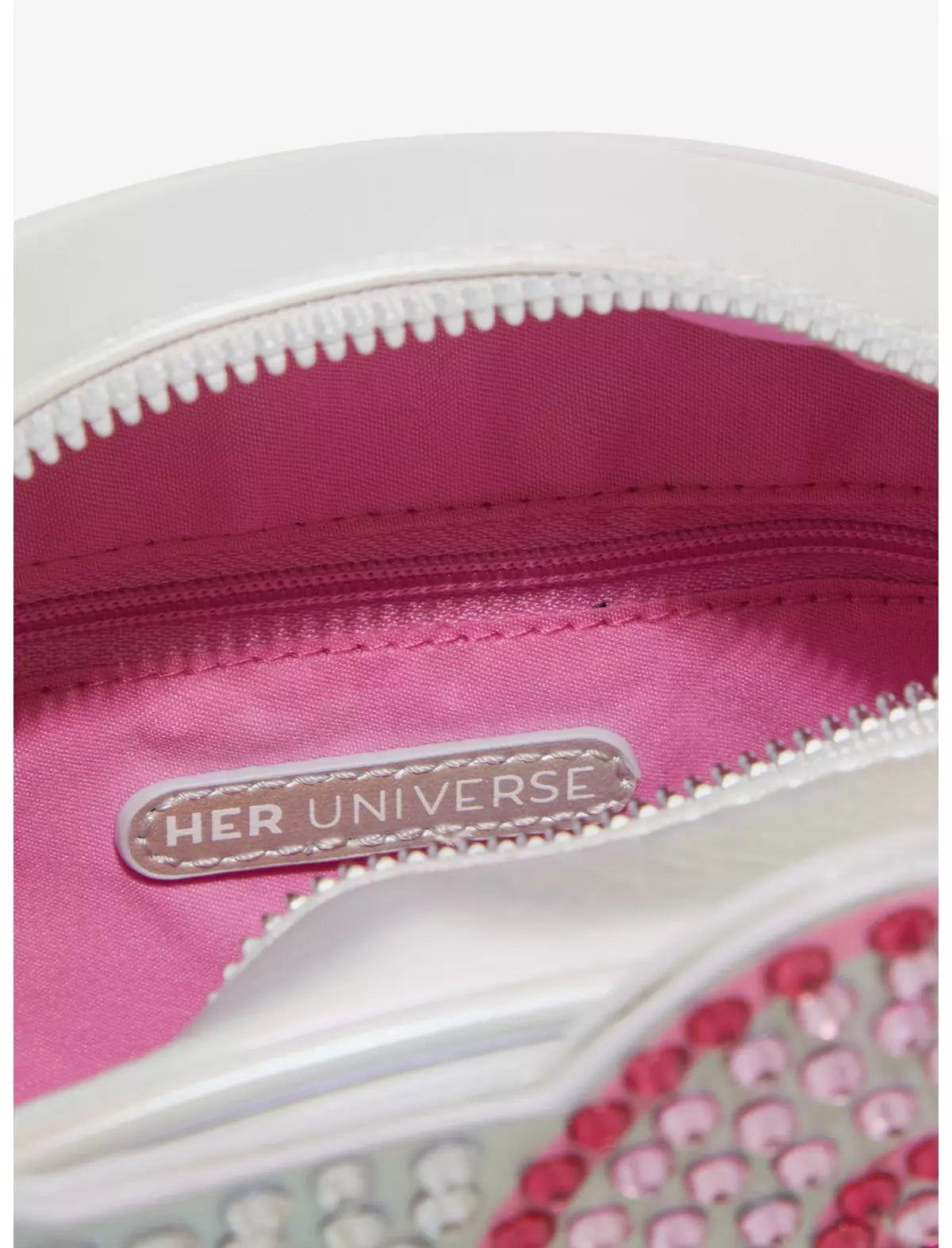 Hello Kitty's here to help you shine! This shiny silver crossbody bag has an appliquéd front panel shaped like her face and decorated with rhinestones. It also has a zippered closure and chain crossbody strap.
