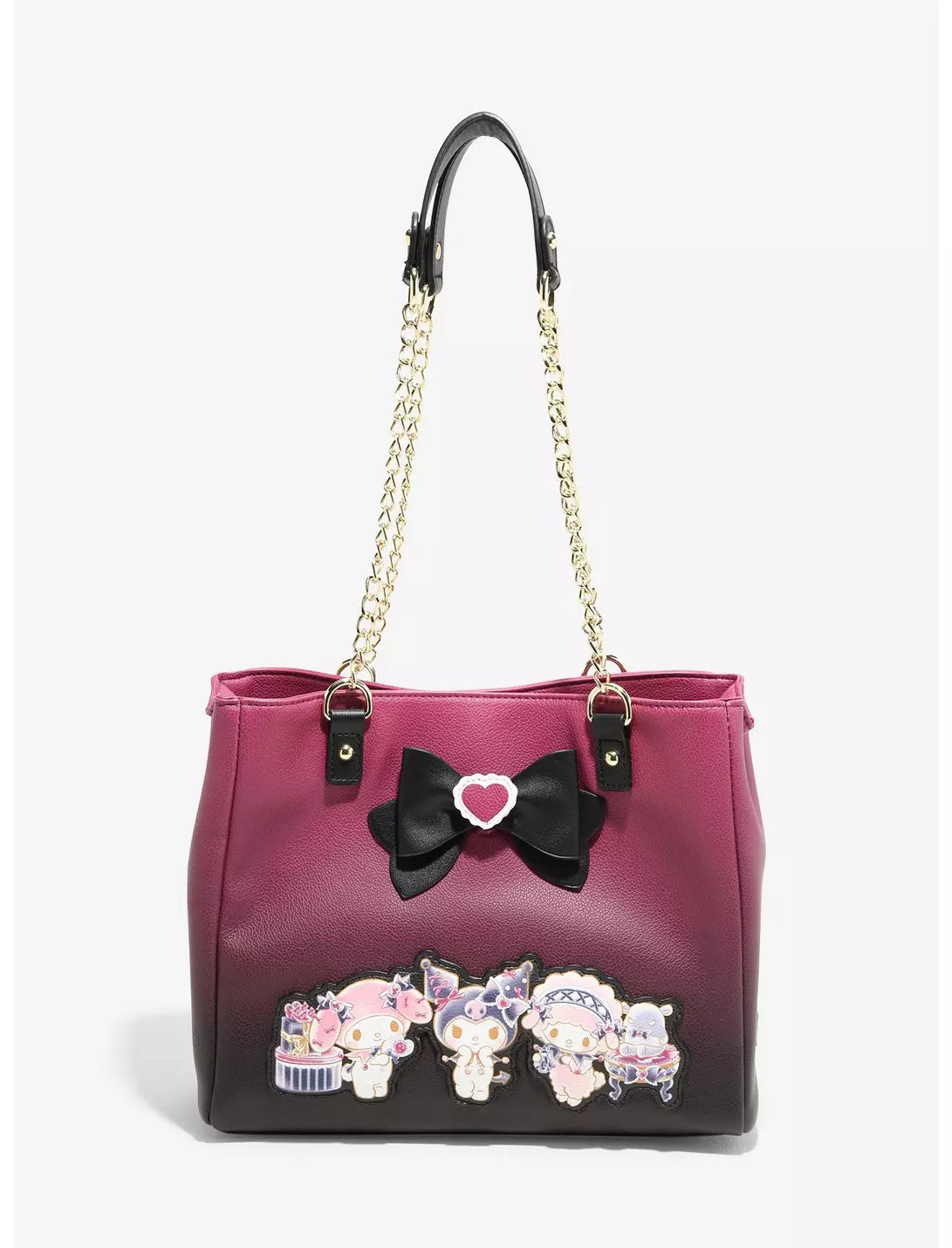 Este bonito bolso de hombro de Her Universe tiene un gráfico aplicado de Kuromi, My Melody, My Sweet Piano y Baku vestidos con moños, y un lazo aplicado con un corazón en el centro arriba. La correa tiene un detalle de cadena en tono dorado y hay una hebilla interior que puede mantener los lados ceñidos. Bolsillo interior con cremallera.