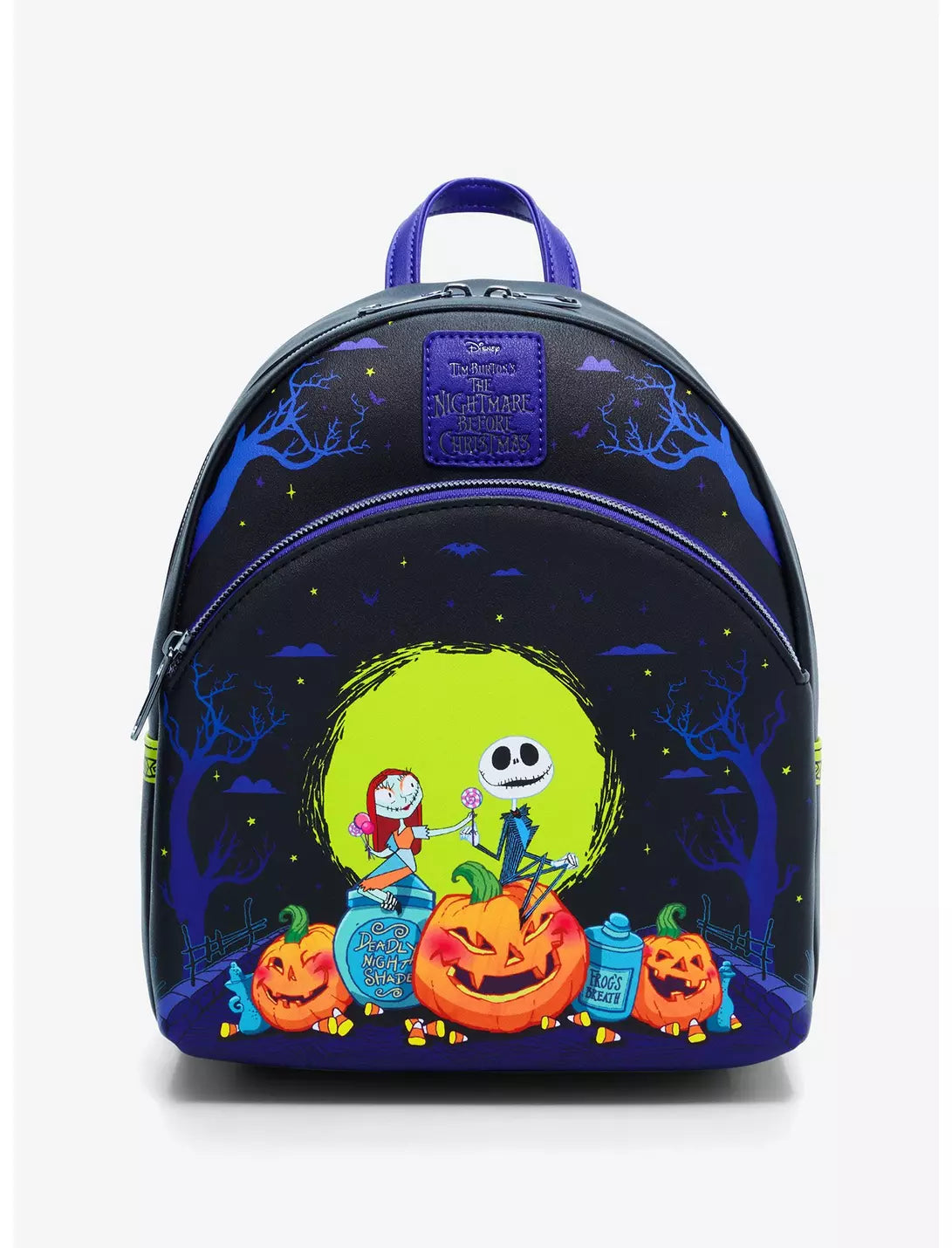 ¡Empaca todos tus elementos esenciales para la fecha del cementerio en esta mini mochila de Pesadilla antes de Navidad! Con una escena espeluznante que representa a los chibi Jack y Sally bajo la luz de la luna, rodeados de linternas y frascos de boticario de Sally. Viene con correas ajustables, bolsillo interior y bolsillo frontal con cremallera.