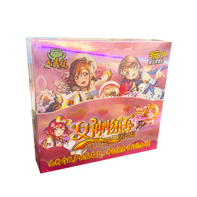 - Cantidad de tarjetas: 100 tarjetas por caja, tarjetas de arte de alta calidad de Goddess Story Feast. Una caja de 20 paquetes, 5 tarjetas por paquete. Cada uno de ellos contiene 5 tarjetas de rareza (por encima de SR)