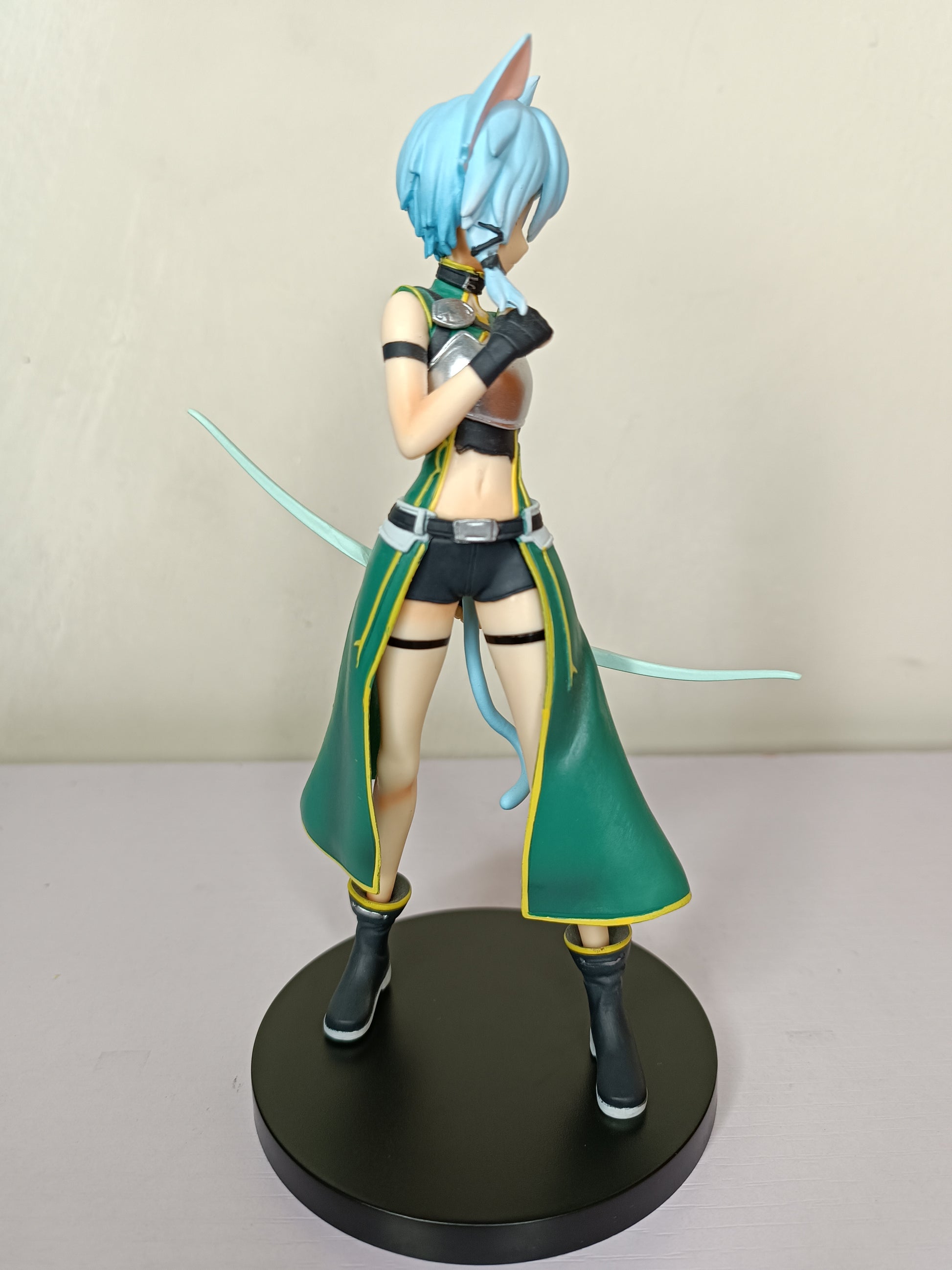 Sinon mide aproximadamente 7 pulgadas desde la parte inferior de la base hasta las puntas de sus adorables orejitas de gato. Su atuendo está muy bien recreado, completo con su guardapolvo verde, armadura para el pecho y los hombros, pantalones cortos y botas gruesas. Incluso tiene su cola de gato azul. Cada detalle es parte de la escultura y luce genial.